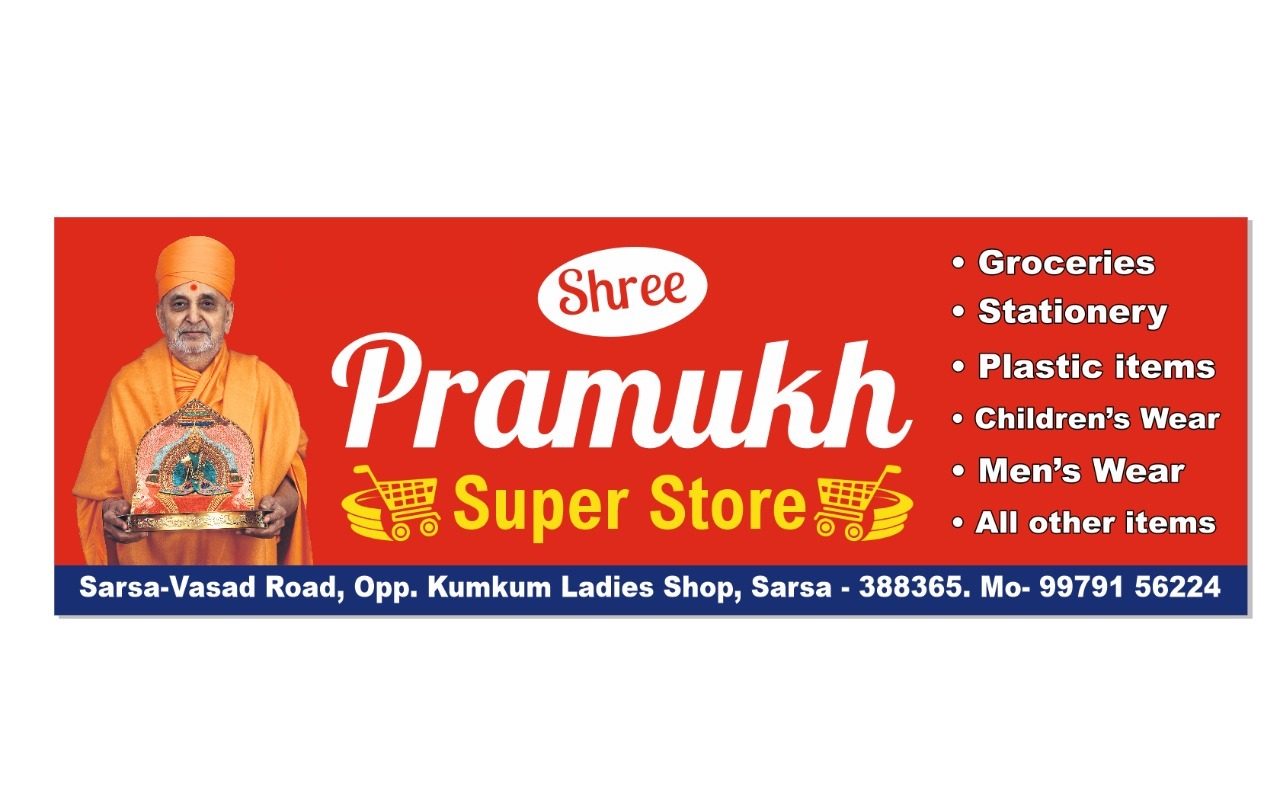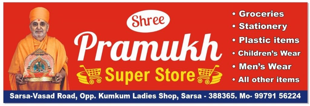 Shree Pramukh Super Store located at Pramukh Point, Sarsa-Vasad Road, Opposite: Kumkum Ladies Shop, Sarsa-388365, Dist-Anand, Gujarat. We sell  Children’s Clothes, Groceries, Stationeries, Disposable items, All kind of Bags, Sports items…etc.